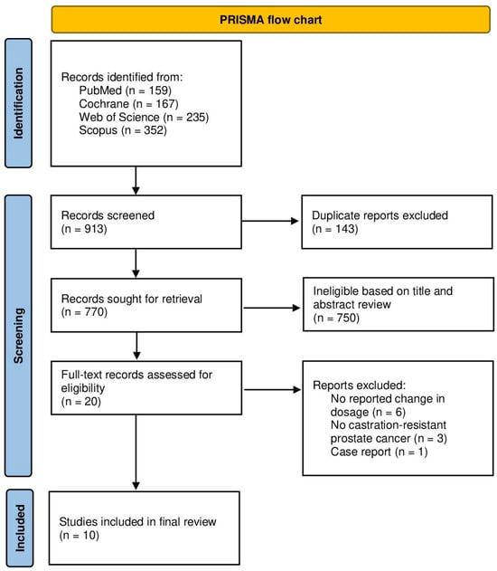 Following the retrieval of 913 records and the removal of 143 duplicates, a total of 770 records underwent title and abstract review. This resulted in the exclusion of 750 records. The remaining 20 publications were assessed for inclusion eligibility via full-text review. Consequently, a total of 10 studies were included in the final review. A PRISMA flow chart summarizing the process is displayed in Figure 1.