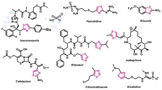 - Niu, Z.; Wang, Y.; Zhang, S.; Li, Y.; Chen, X.; Wang, S.; Liu, H. Application and Synthesis of Thiazole Ring in Clinically Approved Drugs. Eur. J. Med. Chem. 2023, 250, 115172. [Google Scholar] [CrossRef]