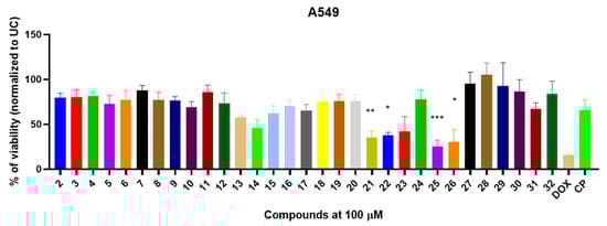Following the successful synthesis and characterization of compounds 2–32, their in vitro antiproliferative activity was evaluated using the well-established A549 human lung adenocarcinoma cell model [40,41,42,43]. To identify the most promising antiproliferative candidates, A549 cells were treated with a fixed concentration (100 µM) of each compound, and the cytotoxic effects were compared to those of the standard FDA-approved chemotherapeutic agents doxorubicin (DOX) and cisplatin (CP) (Figure 2).
