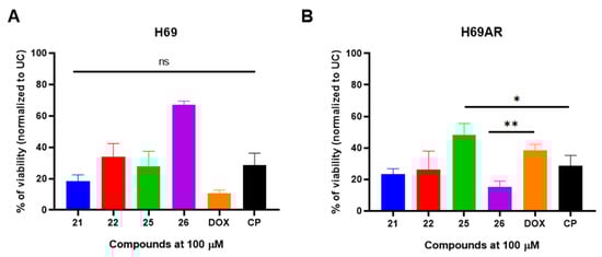 The selected most promising compounds 21, 22, 25, 26 exhibits in vitro antiproliferative activity against susceptible H69 (panel (A)) and anthracycline-resistant H69AR (panel (B)) human lung carcinoma cells. The cells were exposed with compounds or doxorubicin (DOX) and cisplatin (CP) for 24 h and the viability was determined using MTT assay and normalized to untreated control (UC). Data shown are mean ± SD values from three separate experiments for each group. The significance of the data was determined using a one-way ANOVA test. * p < 0.05, ** p < 0.001, ns—not significant.