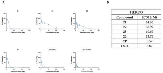 The selected most promising compounds 21, 22, 25, 26 demonstrate favorable cytotoxicity profiles in non-cancerous HEK293 human embryonic kidney cells. Panel (A) shows dose–response kinetics of tested compounds in HEK293 cells, while panel (B) shows calculated IC50 values. The cells were exposed to compounds or doxorubicin (DOX) and cisplatin (CP) for 24 h and the viability was determined using MTT assay. Data shown are mean ± SD values from three separate experiments for each group.