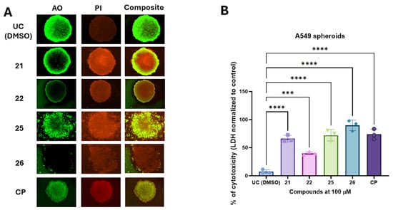 Acridine orange/propidium iodide staining was performed to visualize spheroid morphology and cell viability following treatment with compounds 21, 22, 25, and 26 at 100 µM (Figure 5A). Untreated control (UC) spheroids exhibited a uniform green fluorescence, indicating high viability with minimal PI-positive dead cells. Treatment with compounds 21 and 22 resulted in partial cell death, with spheroids retaining structural integrity but displaying increased PI fluorescence, particularly at the periphery. In contrast, treatment with compounds 25 and 26 led to substantial disruption of spheroid architecture and widespread PI-positive staining, suggesting a higher degree of cytotoxicity in A549 derived tumor spheroids.