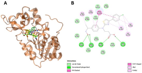 Importantly, the aromatic ring and thiazole moiety of these compounds play a pivotal role in these interactions, directly contributing to the overlap with the ligands at the catalytic sites of the enzymes (Table 3) (Figure 6A,B and Figure 7A,B).