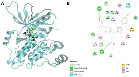 The compound 22 is able to interact with human epidermis growth factor receptor (EGFR). Panel (A) shows visualization of the potential binding site of compound (in green), ligand (in red) and erlotinib (in yellow) into EGFR. Panel (B) shows plotted 2D maps of H-bonds and hydrophobic interactions of compound 22 with EGFR residues. Van der Waals, Pi-sulfur, alkyl and Pi-alkyl are considered hydrophobic interactions.