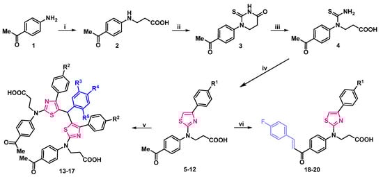 Synthesis of compounds 2–20. (i) 1. acrylic acid, H2O, reflux, 15 h; 2. 10% NaOH; 3. AcOH to pH 6; (ii) 1. KSCN, AcOH, reflux 10 h; 2. HClconc., reflux, 20 min; (iii) 1. 5% NaOH; heated until dissolved; 2. AcOH to pH 5; (iv) 1. 4-substituted phenacylbromide, Me2CO, reflux, 1–3 h; 2. CH3COONa, H2O, reflux, 5 min; (v) 1. ArCHO, Me2O, HClconc., reflux, 5 h; 2. CH3COONa, H2O, reflux, 5 min; (vi) 1. KOH 30%, 4-FPhCHO, 60 °C, 10 h; 2. H2O, heated until dissolved; 3. AcOH to pH 5–6. 5 R1=H; 6 R1=Cl; 7 R1=NO2; 8 R1=CN; 9 R1=F; 10 R1=CF3; 11 R1=OH; 12 R1=OCF3; 13 R2=R3=R5=R5=H; 14 R2=R3=R5=H, R4=F; 15 R2=R3=R5=H, R4=Cl; 16 R2=R4=H, R3=R5=OCH3; 17 R4=F, R2=Cl, R3=R5=H; 18 R1=H; 19 R1=Cl; 20 R1=OCF3.