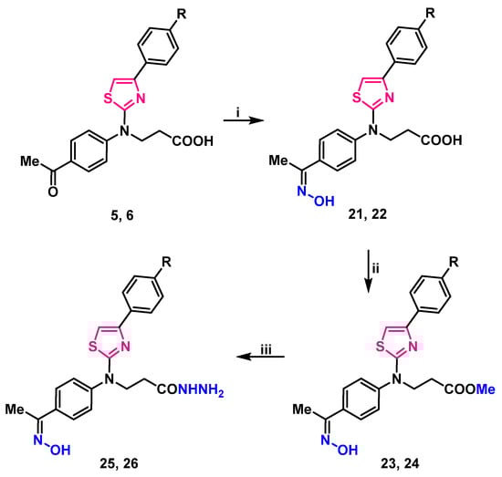 Synthesis and transformation of 3-/[4-(4-substituted phenyl)thiazol-2-yl]{4-[1-(hydroxyimino)ethyl]phenyl}amino/propanoic acids 21, 22. (i) HONH2·HCl, CH3COONa, 2-PrOH, reflux, 1 h; (ii) 1. MeOH, H2SO4, reflux, 4 h; 2. 5% Na2CO3 to pH 7; (iii) N2H4·H2O, 2-PrOH, reflux, 3 h. 5, 21, 23, 25 R=H; 6, 22, 24, 26 R=Cl.