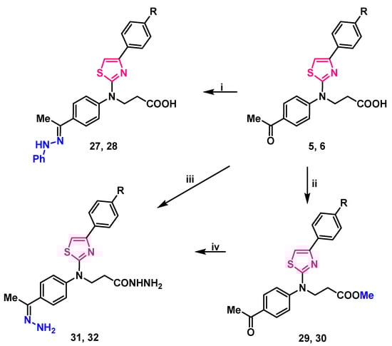Signals in downfield of 1H NMR spectra at 11.30 ppm and resonances at 3126, and 3124 cm−1 in the IR spectra, were attributed to the N–OH group of compounds 21, 22 (respectively) (Supplementary Material, Figures S37–S40). These oximes underwent esterification with an excess of methanol under reflux in the presence of a catalytic amount of sulfuric acid, resulting in methyl 3-/[4-(4-substituted)thiazol-2-yl]{4-[1-(hydroxyimino)ethyl]phenyl}amino/propanoates 23, 24. Carbohydrazides 25, 26 were synthesized by hydrazinolysis of methyl esters 23, 24 with hydrazine hydrate in propan-2-ol under reflux (Scheme 2). Proton signals of NH2 group in 1H NMR spectra were identified as a multiplet, merged with one of the CH2 groups at 4.15–4.36 and 4.14–4.25 ppm, singlet at 9.10, and 9.09 was attributed to NH group proton. N–OH group proton singlet slightly shifted up-field to 11.29 ppm if compared with the esters 23, 24 resonances, which were at 11.31 ppm. Elemental analysis data is in good compliance with calculated values (Supplementary Material, Figures S41–S48).