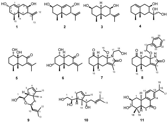 In the concanavalin A (ConA)-induced lymphocyte proliferation assay, compounds 1 and 9 exhibited moderate inhibitory activity with half-maximal inhibitory concentration (IC50) values of 13.55 ± 1.40 μM and 29.25 ± 1.56 μM, respectively. Notably, compound 11 demonstrated more potent suppression against both lipopolysaccharide (LPS)- and ConA-induced lymphocyte proliferation, showing IC50 values of 8.99 ± 1.08 μM (LPS model) and 5.39 ± 0.20 μM (ConA model). Compound 11 exhibited potent activity, presumably attributed to its diterpenoid nature, while the enhanced activity of compound 1 among sesquiterpenoid analogs may be due to the presence of a double bond between C-1 and C-10.