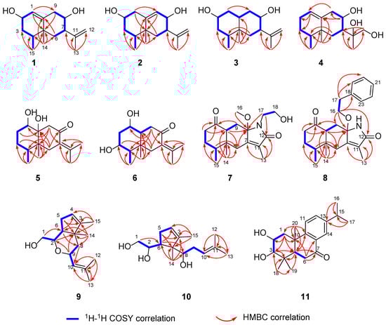 The key 1H−1H COSY and HMBCs of compounds 1–11.