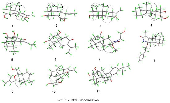 The NOE correlations from CH3-14 and H-2/H-9, as well as between H-1 and H-6, indicate that H-2, CH3-14, and H-9 are positioned on the opposite face relative to H-6 (Figure 3). The experimental ECD data of compound 9 were similar to the calculated data for (2R,6R,7S,9S)-9 (Figure 6), determining the absolute configuration.