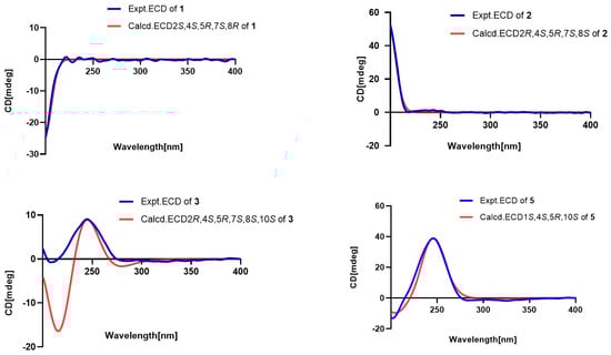 Experimental and calculated ECD spectra of compounds 1–3, 5.