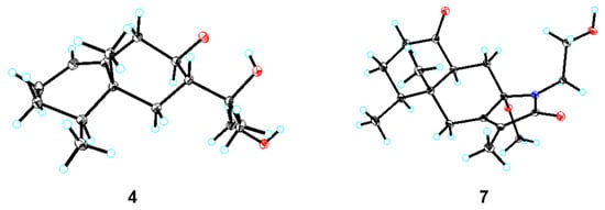 X-ray crystal structures of compounds 4 and 7. Black represents C atoms, blue represents H atoms, red represents O atoms.