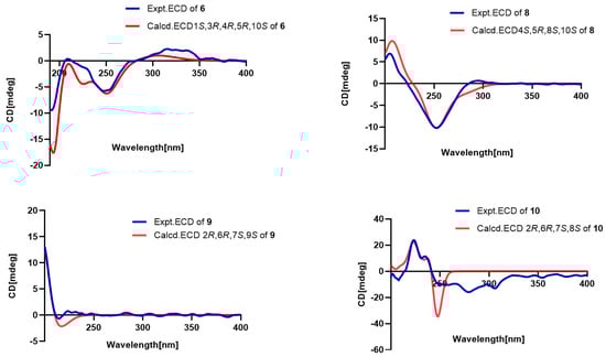 Experimental and calculated ECD spectra of compounds 6, 8–10.