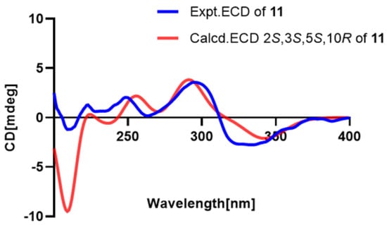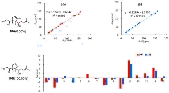 In the NOESY spectrum, H-6 showed correlations with H-9, and CH3-14 exhibited mutual correlations with H-2 and H-5ax. A weak correlation between H-6 and H-5ax, contrasted with a strong correlation between H-6 and H-5eq, indicated that CH3-14, H-5ax, and H-2 are positioned on the opposite face of the ring relative to H-6. The relative configuration was deduced as 2R*,6R*,7S*. Based on Snatzke’s method [17], the treatment of 10 with Mo2(OAc)4 derived an Mo2(OAc)4 complex, whose ECD data showed a positive cotton effect at 311 nm and 400 nm in DMSO (Figure 7), reflecting the 2R configuration. To identify the final structure for compound 10, the theoretical 13C NMR calculation with DP4+ probability analyses were employed. The 13C NMR chemical shifts in two possible isomers, 10A (2R,6R,7S,8R*) and 10B (2R,6R,7S,8S*), were calculated at the B3LYP-D3(BJ)/6-31G* level, and the calculated results for 10B (R2 = 0.9973) showed a better match to the experimental data than 10A (R2 = 0.995). Furthermore, according to the DP4+ probability analyses, 10B was assigned with a 100% probability (Figure 8). The above messages demonstrated 10B to be the right relative structure for compound 10. The absolute configuration of compound 10 was finally determined as 2R,6R,7S,8S by comparison of the experimental and computed ECD curves (Figure 6).