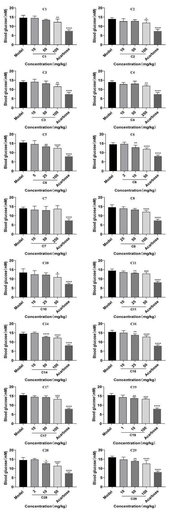 2.8. Effects of 16 Flavonoids on Postprandial Hyperglycemia in Normal Mice
