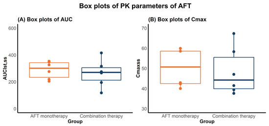 Box plots of PK parameters of AFT in mice following AFT monotherapy or combination therapy with HAD-B1. (A) AUClst’ss and (B) Cmaxss. Each dot represents a parameter value of an individual animal. Boxes indicate the interquartile range (IQR), with the bold line indicating the median, and whiskers representing 1.5× IQR.