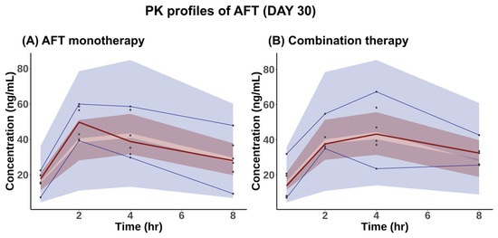 VPCs of serum concentrations of AFT versus time on Day 30 following the administration of AFT with or without HAD-B1 for a consecutive 30 days. (A) AFT monotherapy: 10 mg/kg/day AFT and (B) Combination therapy: 10 mg/kg/day AFT + 400 mg/kg/day HAD-B1. The red solid line indicates the median of the observed PK data, with the light-red shade indicating the 95% confidence interval of the median predicted concentrations. The blue solid lines indicate the 5th and 95th percentiles of the observed PK data, while the light-blue shade shows the 90% prediction intervals of the predicted concentrations. Black dots are the observed PK data.