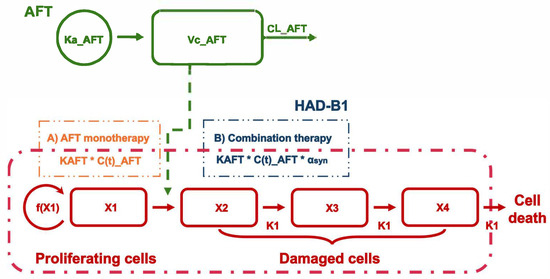 The PK/PD model was developed to characterize the antitumor effects of AFT and its combination with HAD-B1. Figure 3 presents a schematic representation of the developed PK/PD model.