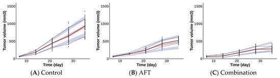 Simulations were conducted based on the final PK/PD model to predict and compare tumor responses under the following dosing schedules: the AFT group received 10 mg/kg of AFT once daily, whereas the COMB group received 10 mg/kg of AFT and 400 mg/kg of HAD-B1 once daily. As illustrated in Figure 5, CONTROL, AFT, and COMB groups reached the tumor volume threshold (350 mm3) in 16, 22, and 28 days, respectively. The COMB group showed greater tumor inhibition relative to the control and AFT monotherapy groups.