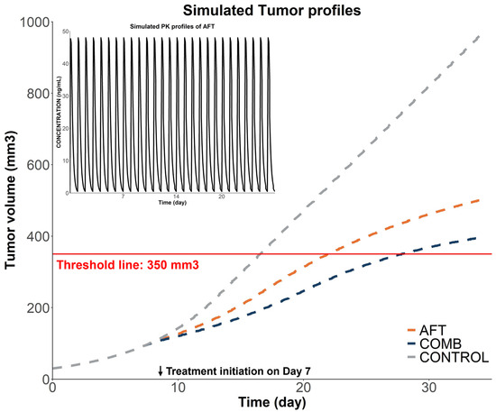 Simulated tumor volumes versus time under different treatment groups. AFT: 10 mg/kg/day of AFT; COMB: 10 mg/kg/day of AFT + 400 mg/kg of HAD-B1 once daily. The solid red line represents a tumor volume threshold of 350 mm3 and the dashed line represents the predicted tumor volume profiles for each of the groups. The figure in the upper left corner shows the simulated serum concentration–time profile of AFT at a dose of 10 mg/kg/day. AFT represents AFT monotherapy, COMB represents combination therapy, and CONTROL represents the control group.
