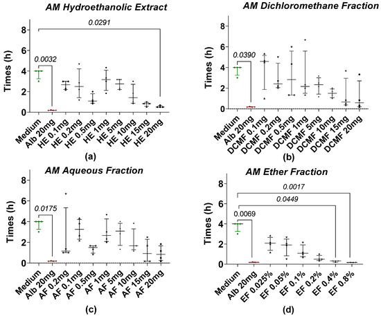 Loss of motility of the tapeworm in the presence of AM extract and fractions. (a) The hydroethanolic extract (HE), (b) the dichloromethane fraction (DCMF), (c) the aqueous fraction (AF), and (d) the ether fraction (EF). Alb refers to Albendazole. The green dots represent the negative control (medium), the red dots represent the reference drug (albendazole), and the black dots represent the different concentrations of plant extracts. Data are expressed as the median, and each point represents the mean time of loss of motility from 4 independent experiments with 5 worms per experiment. Statistical analysis was performed using the Kruskal–Wallis and Dunn’s post hoc tests.