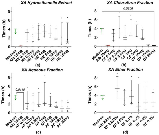 Loss of motility of the tapeworm in the presence of XA extract and fractions. (a) The hydroethanolic extract (HE), (b) the chloroform fraction (CF), (c) the aqueous fraction (AF), and (d) the ether fraction (EF). Alb refers to Albendazole. The green dots represent the negative control (medium), the red dots represent the reference drug (albendazole), and the black dots represent the different concentrations of plant extracts. Data are expressed as the median, and each point represents the mean time of loss of motility from 4 independent experiments with 5 worms per experiment. Statistical analysis was performed using the Kruskal–Wallis and Dunn’s post hoc tests.