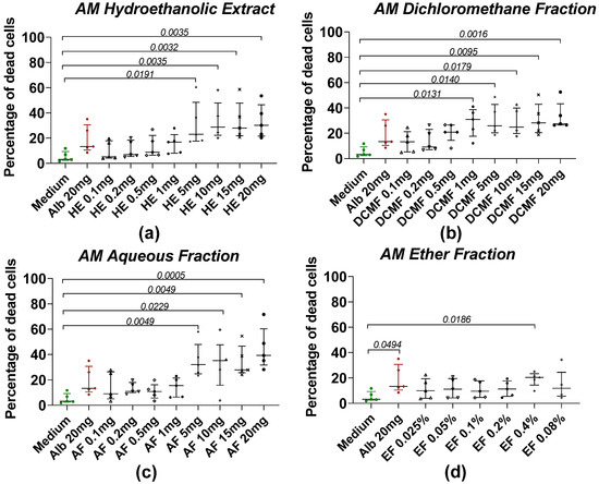 Induction of worm cell death by different fractions of AM. (a) The hydroethanolic extract (HE), (b) the dichloromethane fraction (DCMF), (c) the aqueous fraction (AF), and (d) the ether fraction (EF). Alb refers to Albendazole. The green dots represent the negative control (medium), the red dots represent the reference drug (albendazole), and the black dots represent the different concentrations of plant extracts. Data were expressed as the median, and each point represents the percentage of cell death of one worm. The experiment was performed on 5 worms. Statistical analysis was performed using the Kruskal–Wallis and Dunn’s multiple comparison post hoc test.
