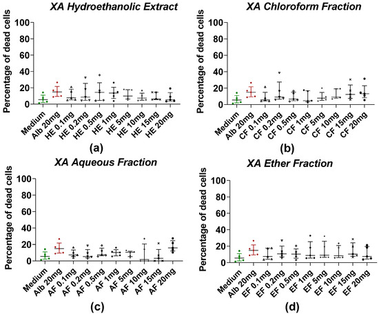 Induction of worm cell death by different fractions of XA. (a) The hydroethanolic extract (HE), (b) the chloroform fraction (CF), (c) the aqueous fraction (AF), and (d) the ether fraction (EF). Alb refers to Albendazole. The green dots represent the negative control (medium), the red dots represent the reference drug (albendazole), and the black dots represent the different concentrations of plant extracts. Data were expressed as the median, and each point represents the percentage of cell death of one worm. The experiment was performed on 5 worms. Statistical analysis was performed using the Kruskal–Wallis and Dunn’s multiple comparison post hoc test.