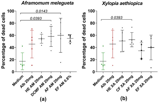 Percentage of dead cells after loss of motility of worms in the presence or absence of hydroethanolic extract (HE) and fractions of AM (a) and XA (b) at a concentration of 20 mg/mL. Alb refers to Albendazole. The green dots represent the negative control (medium), the red dots represent the reference drug (albendazole), and the black dots represent the different concentrations of plant extracts. Data are expressed as the median, and each point represents the percentage of cell death of one worm. The experiment involved 5 worms. Statistical analysis was conducted using the Kruskal–Wallis and Dunn’s multiple comparison.