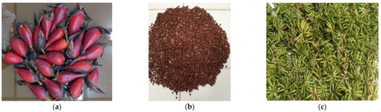 Plant material used in this study: (a) fruits of Aframomum melegueta K. Schum.; (b) seeds of Aframomum melegueta K. Schum.; (c) fruits of Xylopia aethiopica (Dunal) A. Rich.