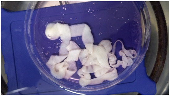 Isotonic saline water (B. BRAUN, Melsungen, Germany) was used to wash all the worms and to remove all fecal material. The worms were immediately placed in RPMI 1640 medium (Gibco, Paisley, Scotland, UK) to maintain viability during transport to the laboratory. Slaughter of the animals began at 4 a.m. The time taken to wash all the intestines and collect the worms, if present, and then transport them to the laboratory varied between 4 and 6 h. However, once in the laboratory, the viability of worms was assessed by heating them in RPMI 1640 medium (Thermo Fisher Scientific, Waltham, MA, USA) at 45 °C in a water bath (Figure 7). A four-point scoring system ranging from 0 to 3 was used to describe the motility of worms in the different Petri dishes [53]. The vigorous movement of worms was scored at 3, the sluggish shaking of worms was scored at 2, the intermittent shaking of worms was scored at 1, and no movement (immotile) was scored at 0.