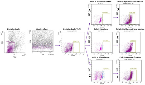 To assess the effect of the extract on Taenia cells, we performed a propidium iodide (PI) staining on Taenia cells derived from dead worms (loss of motility) and on Taenia live cells after exposure to the plant compound. Briefly, adult worms were exposed to the extract, as described, and after loss of motility (12–18 h), the five worms were digested with 100 µL of collagenase (Roche Diagnostics, Mannheim, Germany) at a concentration of 2 mg/mL and incubated at 37 °C with 5% CO2 for 3–4 h. In addition, five live worms were digested with collagenase, as described, and the obtained cells were co-cultured with the extracts for 12–18 h. Cells from dead worms and the exposed cells were then stained with PI. The rate of cell cytotoxicity in both cases was compared. The gating strategy used is presented in Figure 8.