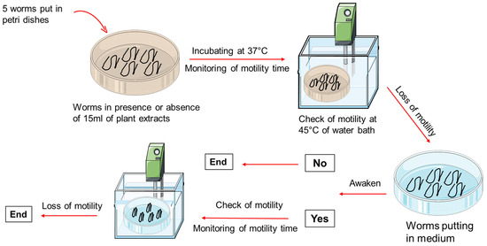 Plants have long been recognized as valuable sources of bioactive molecules to treat various diseases. Since then, numerous studies have investigated their biological activities against parasites, especially helminths [38,39]. Various worm species were used to evaluate the anthelmintic potential of plant extracts, as in a study by Buza et al. that demonstrated the anthelmintic activity of six aqueous medicinal plant extracts against donkey strongyles [40]. In another study, Lumbricus terretris worms were used to test the anthelmintic activity of aqueous and ethanolic extracts of Vernonia amygdalina and Alstonia boonei [41].