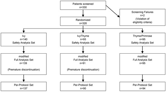 In total, 330 patients were screened. Of these, 328 patients were randomized. The prospectively defined, unequal allocation between the study arms resulted in a group of n = 140 Ivy patients and 188 non-Ivy patients distributed in two groups (Ivy/Thyme: n = 93, Thyme/Primrose: n = 95). Three patients discontinued the study prematurely and were excluded from the modified Full Analysis Set (mFAS). The mFAS thus comprised 325 patients. Four patients were excluded from the PPS, including two patients from the Ivy group and one patient each in the Ivy/Thyme and Thyme/Primrose group. The PPS thus included 321 patients (Figure 1).