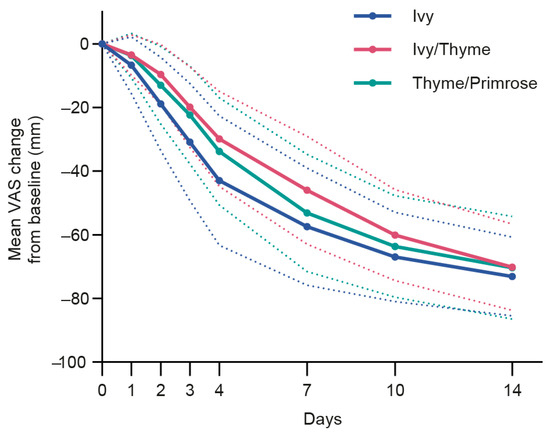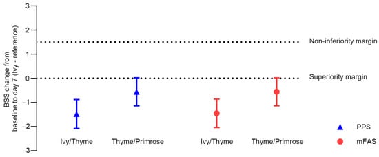 In the PPS, the mean BSS change from baseline to day 7 was −9.11 score points (SD: 2.44) in the Ivy group, −7.64 points (SD: 2.68) in the Ivy/Thyme group, and −8.59 points (SD: 2.45) in the Thyme/Primrose group. Thus, the non-inferiority of Ivy extract was shown to be statistically significant against both comparators: against Ivy/Thyme extract (LS means treatment effect for change: 1.48 points, 95% CI: −2.08; −0.89, p < 0.0001) and against Thyme/Primrose extract (LS means treatment effect for change: −0.56 points, 95% CI: 1.14; 0.02, p < 0.0001, Figure 2). Hence, both primary endpoints could be reached in the first, a priori, ordered steps.