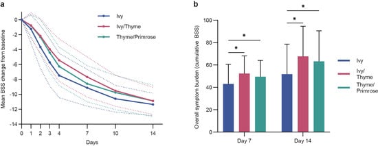 Mean change in BSS from baseline to all post-baseline visits was more pronounced in the Ivy group compared to the Ivy/Thyme and Thyme/Primrose group, respectively, for the 7-day treatment phase and over the further 7-day post-treatment observational period (Figure 3a). This pattern of results is also reflected in the overall symptom burden over the entire treatment and observational period, indicating the lowest overall symptom burden in the Ivy group (p < 0.05 for all post-baseline visits) (Figure 3b).
