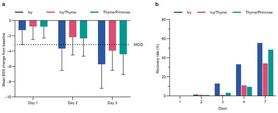 The threshold of a MCID (3.15 points on the BSS) was surpassed on day 2 for the Ivy group (mean change: −3.66 points) and on day 3 for the Ivy/Thyme (mean change: 3.95 points) and Thyme/Primrose (mean change: −4.41 points) groups (Figure 4a).