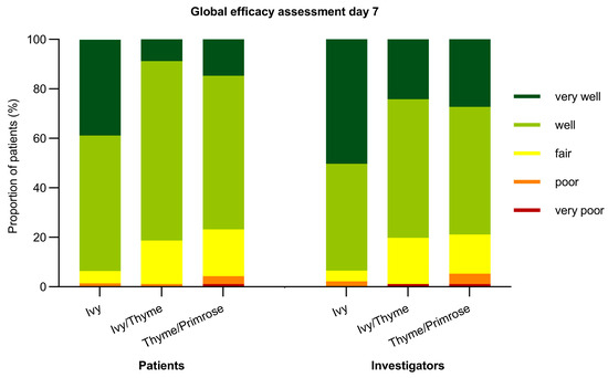 For both patients and investigators, global efficacy was judged better for Ivy extract compared to Ivy/Thyme extract and Thyme/Primrose extract, respectively, on days 7, 10, and 14 (all p < 0.0001) (Figure 6 and Supplementary Figure S1).
