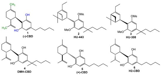 Chemical Structures of (−)-CBD (1), HU-443 (2), HU-308 (3), DMH-CBD (4), (+)-CBD (5), and H2-CBD (6).