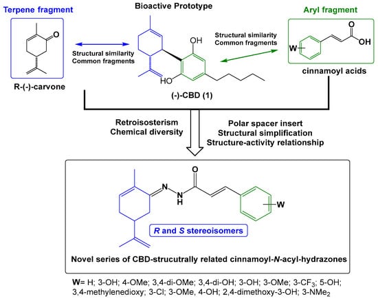 Therefore, given the controversial current global legislation about cannabis versus the promising therapeutic benefits of CBD and its analogues, many research groups have dedicated efforts to the discovery of new synthetic cannabinoids and CBD-based analogues as drug candidates. Herein, we report for the first time the synthesis and evaluation of a series of terpene-cinnamoyl-acyl-hydrazones, designed as CBD-based structural analogues with potential antinociceptive and anti-inflammatory activity.