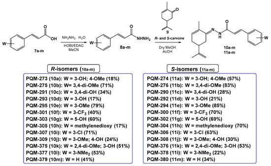 The synthesis of the target compounds was performed in a linear two-step route (Figure 3). In the first step, a series of commercially available functionalized cinnamic acids (7a–m) was converted into the corresponding hydrazides (8a–m) by a hydrazinolysis reaction with hydrazine hydrate, catalyzed by EDAC/HOBt [18]. Next, hydrazides 8a–m were acid-catalyzed reacted with R- or S-carvone, leading to the desired series of R-(10a–m) and S-N-acyl-hydrazones (11a–m), respectively. As a result, 26 compounds were obtained as pure solids in 17–83% yields (analytical and spectroscopic data available in the Supplementary Materials).