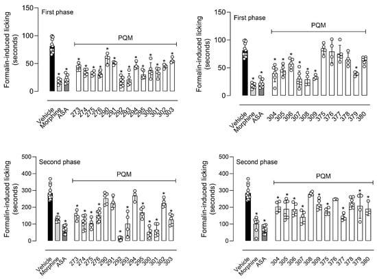 Figure 4 demonstrates that pre-treatment of mice with a single dose of 10 µmol/kg of each compound resulted in a significant reduction in the licking behavior in the neurogenic (first phase) of the formalin assay. Except for PQM-375 (10k) to PQM-378 (11l), and PQM-380 (11m), all other compounds caused a reduction in the mice response, particularly for PQM-292 (11d), PQM-293 (10d), PQM-295 (10e), PQM-307 (10i), PQM-308 (11j), and PQM-309 (10j), which exhibited antinociceptive activity comparable to morphine, which was used as the reference drug. Regarding the inflammatory phase (second phase) of the model, it was observed that PQM-290 (11c), PQM-291 (10c), PQM-294 (11e), PQM-308 (11j), PQM-376 (11k), and PQM-378 (11l) did not show significant ability to reduce formalin-induced inflammatory response. In contrast, PQM-292 (11d) stood out among all other compounds for exhibiting the highest antinociceptive effect, almost completely abolishing the response to painful stimuli at a dose of 10 μmol/Kg, even when compared to the positive control groups of morphine and ASA.