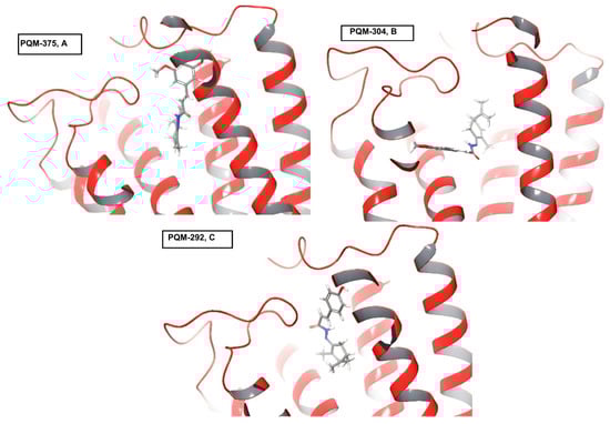 Distinct positions predicted for compounds PQM-375 (10k), PQM-304 (11h), and PQM-292 (11d) in the docking results for CB1. For the PQM compounds: C atoms are represented in grey, O atoms in red, H atoms in white, and N atoms in blue.