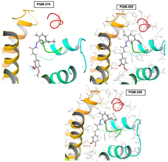 Interestingly, the analysis of a possible structure–interaction relationship revealed that most compounds substituted with one or two methoxy groups in the aromatic ring, regardless the stereochemistry at the terpene subunit, such as PQM-275, PQM-276, PQM-375, PQM-376, PQM-294, PQM-295, PQM-300, PQM-307, PQM-308, and PQM-309, as well as the two 3-dimethylamine analogues PQM-377, PQM-378, the 5-hydroxy analogue PQM-303, and PQM-379, which tend to adopt a similar orientation and establish similar interactions, with the terpene subunit facing the interior of the protein cavity, as highlighted for PQM-375 in Figure 7A. In contrast, the 3,4-methylene-dioxy analogue PQM-304 assumed a different orientation, allowing interactions with the terpene subunit facing the exterior of the cavity (Figure 7B). On the other hand, the compounds PQM-273, PQM-274, PQM-290, PQM-291, PQM-380, PQM-292, PQM-293, PQM-301, PQM-302, PQM-305, and PQM-306 were predicted to assume completely different conformation with the terpene subunit twisted to the opposite side of those previously mentioned, as highlighted for PQM-292 in Figure 7C.