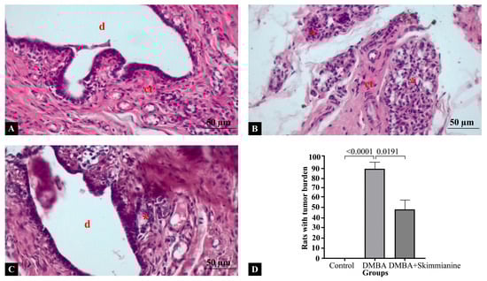 Cross-sections of mammary glands stained by hematoxylin and eosin staining in (A) control, (B) DMBA, and (C) DMBA + skimmianine groups. (D) Tumor burden of rats across groups. Ductal structures (d), connective tissue (ct), malignant cells (*). Magnification: 20×.