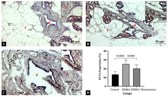 Mammary gland sections were stained with PCNA primary antibody to show cellular proliferation (Figure 2). In the control group, a low PCNA expression showed minimal cell proliferation. Few or no nuclei were stained with PCNA positively, as expected in a healthy mammary gland with fatty tissue and ductal structures (Figure 2A). In the DMBA group, a high PCNA expression was evidenced by numerous darkly stained nuclei, suggesting increased cell proliferation. The presence of malignant clusters with significant proliferative activity of PCNA expression (Figure 2B) was observed. In the DMBA + skimmianine group (Figure 2C), moderate PCNA expression was observed compared to the DMBA group. There were some positively stained cells but fewer than in the DMBA group, indicating the potential antiproliferative effect of skimmianine, suggesting reduced tumor progression. Statistical quantitative analysis showed PCNA expression was significantly increased in the DMBA group compared to cthe ontrol group (13.0 ± 3.0% vs. 25.0 ± 4.0%, respectively); skimmianine treatment significantly downregulated the expression in the DMBA + skimmianine group (20.0 ± 4.1%) (p < 0.0001) (Figure 2D). Our findings indicate that PCNA expression correlates with cell proliferation, and skimmianine may have a suppressive effect on tumor growth.