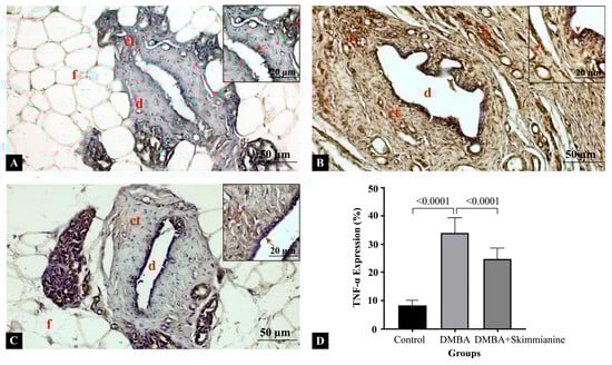 Mammary gland sections were stained with TNF-α primary antibody to show inflammation (Figure 3). In the control group, there was minimal or no TNF-α expression. Normal mammary gland architecture was observed, with intact ductal and connective tissue. Fatty tissue appeared normal, without a significant inflammatory response (Figure 3A). Compared to the control group, the DMBA group showed strong TNF-α expression, suggesting increased inflammation, with the disruption of ductal and connective tissue structures. Dense cellular infiltration, consistent with a pro-inflammatory and tumor-promoting microenvironment, were evident around ductal structures (Figure 3B). Compared to the DMBA group, skimmianine treatment lowered the TNF-α expression after DMBA induction. Reduced inflammation was observed compared to the DMBA-only group, indicating the potential anti-inflammatory effect of skimmianine. Fatty tissue remained more intact, suggesting a protective effect (Figure 3C). Statistical analysis of the semi-quantitative measurement of TNF-α expression show it was significantly increased in the DMBA group compared to the control group (8.4 ± 1.7% vs. 34.0 ± 5.3%, respectively), while skimmianine treatment significantly downregulated its expression in the DMBA + skimmianine group (25.0 ± 3.9%) levels (p < 0.001) (Figure 3D). Skimmianine treatment appears to reduce TNF-α levels, suggesting its potential anti-inflammatory and antitumor effects.