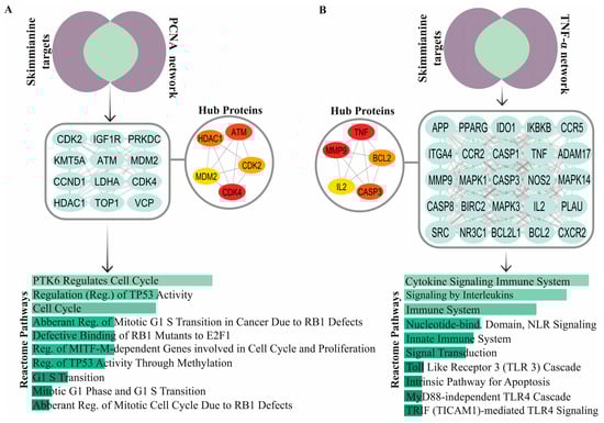 Protein–protein interaction (PPI) network and functional enrichment analysis of skimmianine-associated PCNA (A) and TNF-α (B) targets. PPI network visualization illustrating hub proteins ranked by importance using the MCC algorithm, where red represents the highest-ranked hub proteins and yellow indicates lower-ranked hub proteins. Functional annotation of shared targets presented as a bar chart, with Reactome pathways ranked by ascending adjusted p-values (p < 0.05). NLR: Leucine Rich Repeat Containing Receptor.