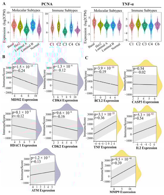 To comprehensively examine the role of PCNA and TNF-α in breast cancer, molecular subtype correlation analysis was initially performed to determine their relationship with different tumor subtypes. This analysis was conducted to assess whether PCNA and TNF-α are differentially expressed across subtypes. The results showed significant associations, with both PCNA and TNF-α exhibiting a higher expression in the basal subtype of breast cancer (p < 0.05). To further investigate the immunological impact, immune subtype analysis was performed to classify tumors into six distinct immune-based clusters (C1–C6). This analysis aimed to determine whether PCNA and TNF-α exhibit distinct expression patterns across immune subtypes, providing insights into their role in shaping immune responses within the TME. The analysis revealed that PCNA and TNF-α exhibited their highest expression levels in the C2 (IFN-γ dominant) subtype, which is characterized by strong immune activation and increased cytotoxic T-cell activity [16] (Figure 5A).