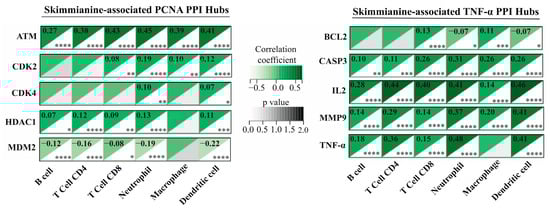 Correlation of skimmianine-associated PCNA and TNF-α PPI hub proteins with tumor immune infiltration. Heatmap analysis depicting the correlation between skimmianine-associated PCNA (ATM, CDK2, CDK4, HDAC1, MDM2) and TNF-α (BCL2, CASP3, IL2, MMP9, TNF-α) hub proteins with six major immune cell infiltrates in breast cancer. In the heatmaps, green regions denote correlation coefficients, whereas black regions represent p-values, with significance levels indicated as * p < 0.05, ** p < 0.01, *** p < 0.005, and **** p < 0.001.